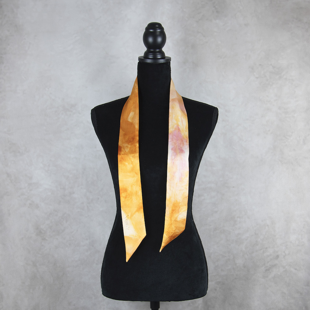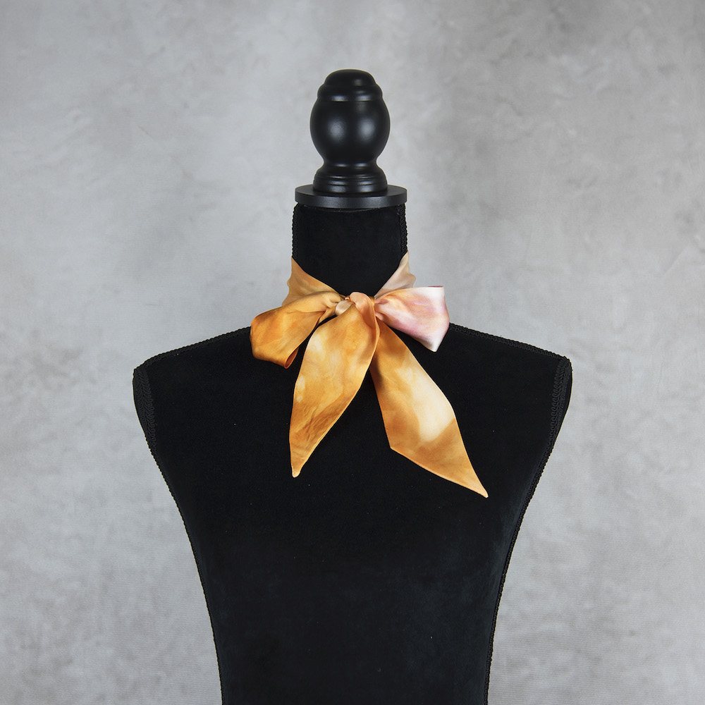 Postup tvorby: Šatka je farbená špeciálnym spôsobom, 100% prírodným pigmentom určeným priamo na farbenie hodvábu. Farba je zafixovaná, šatka vypratá a ošetrená fixátorom farieb. Okraje sú ručne prešité a následne je celá šatka vyžehlená.