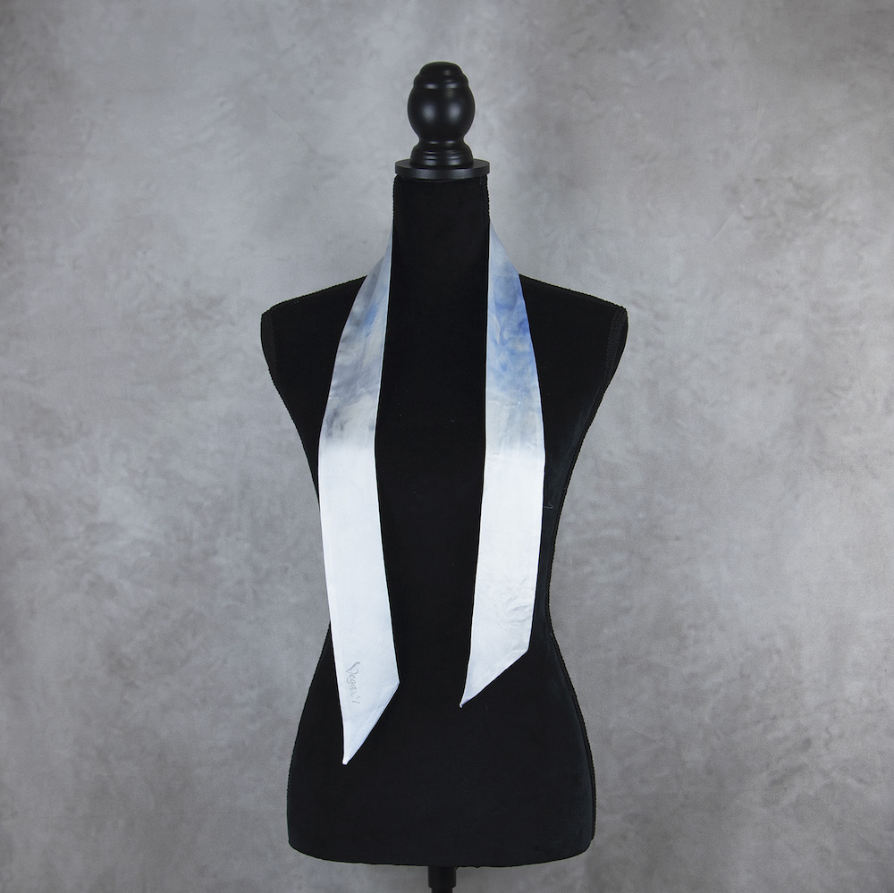 Postup tvorby: Šatka je farbená špeciálnym spôsobom, 100% prírodným pigmentom určeným priamo na farbenie hodvábu. Farba je zafixovaná, šatka vypratá a ošetrená fixátorom farieb. Okraje sú ručne prešité a následne je celá šatka vyžehlená.
