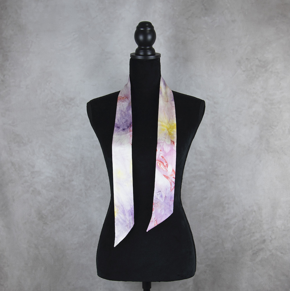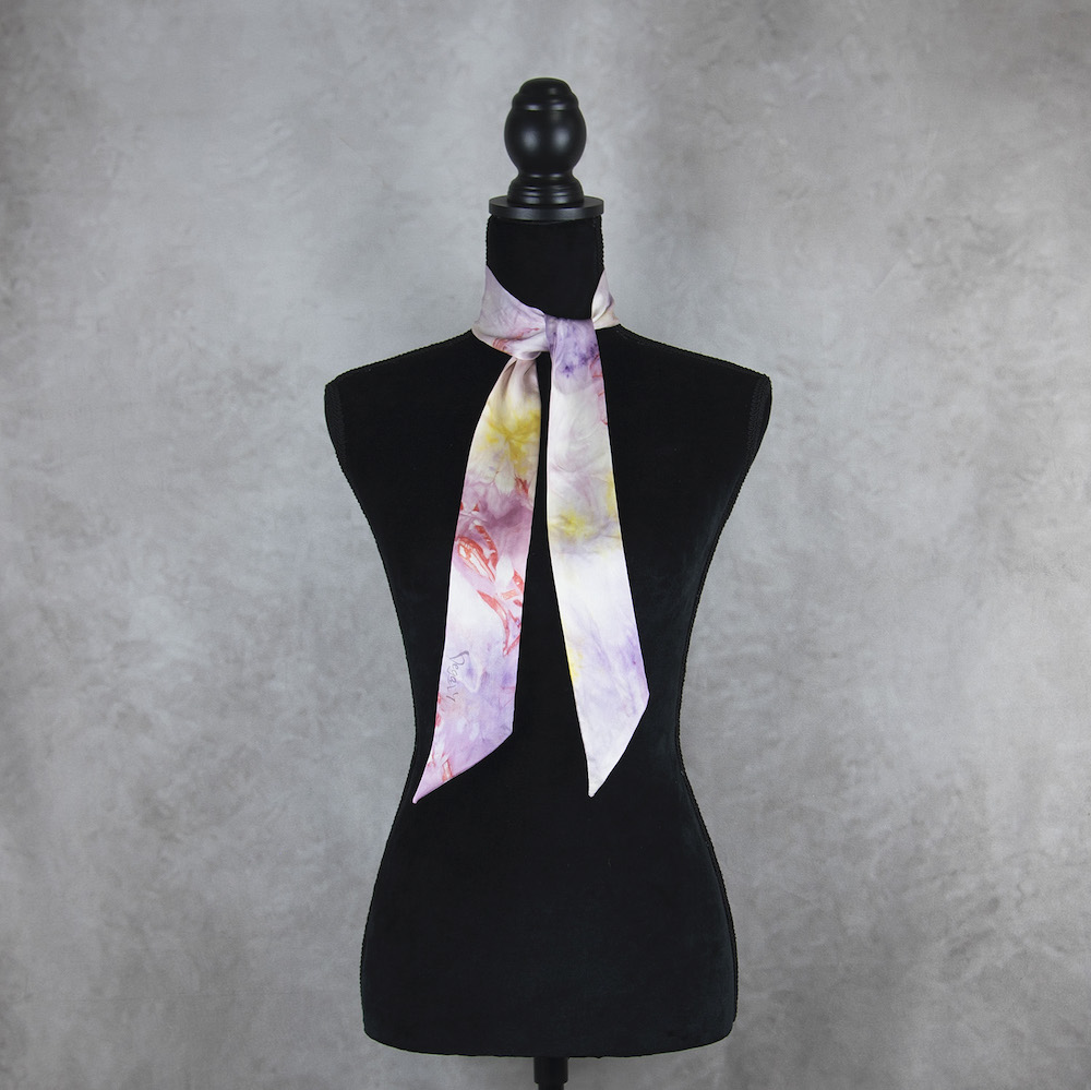 Postup tvorby: Šatka je farbená špeciálnym spôsobom, 100% prírodným pigmentom určeným priamo na farbenie hodvábu. Farba je zafixovaná, šatka vypratá a ošetrená fixátorom farieb. Okraje sú ručne prešité a následne je celá šatka vyžehlená.