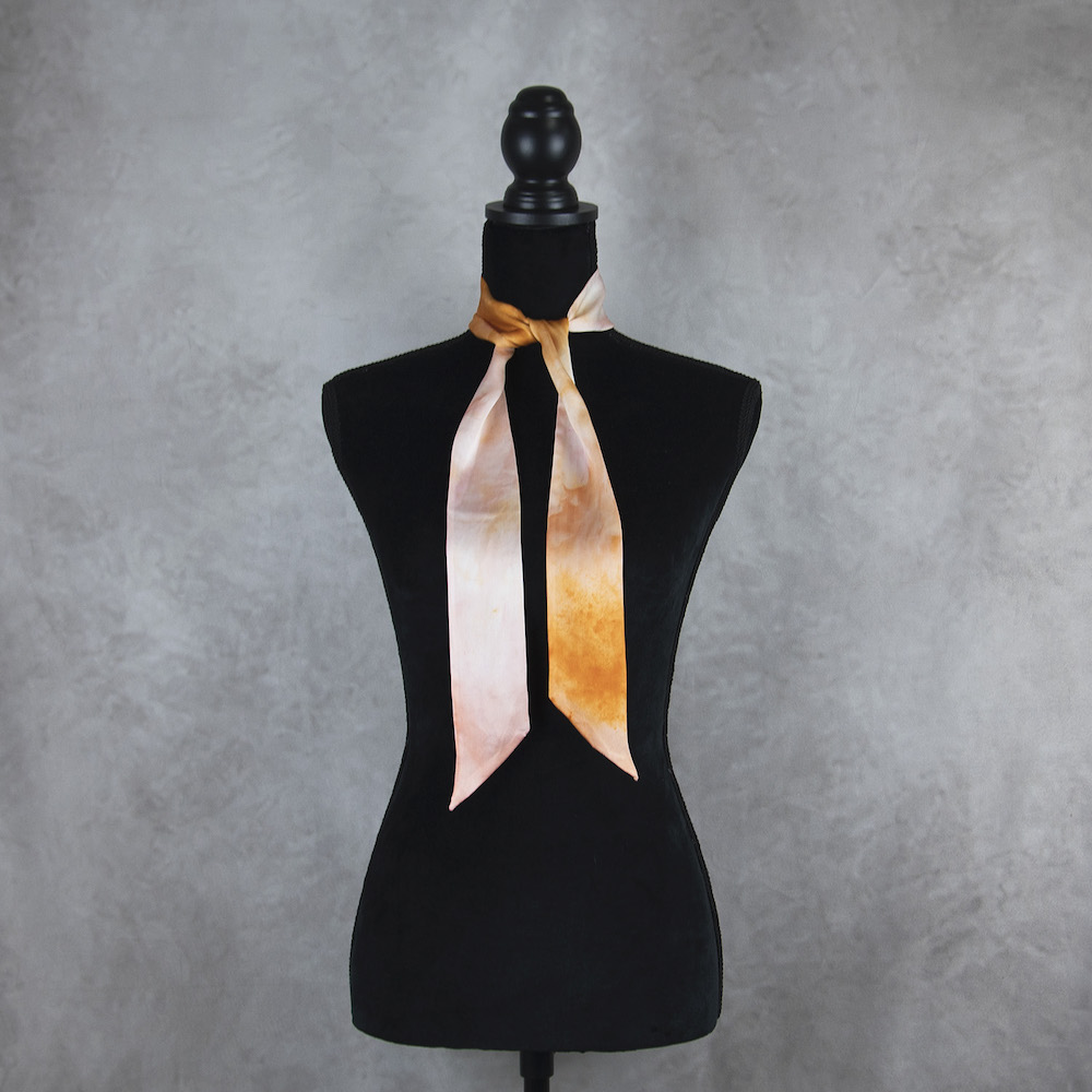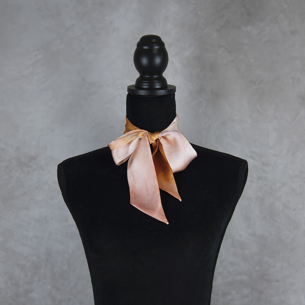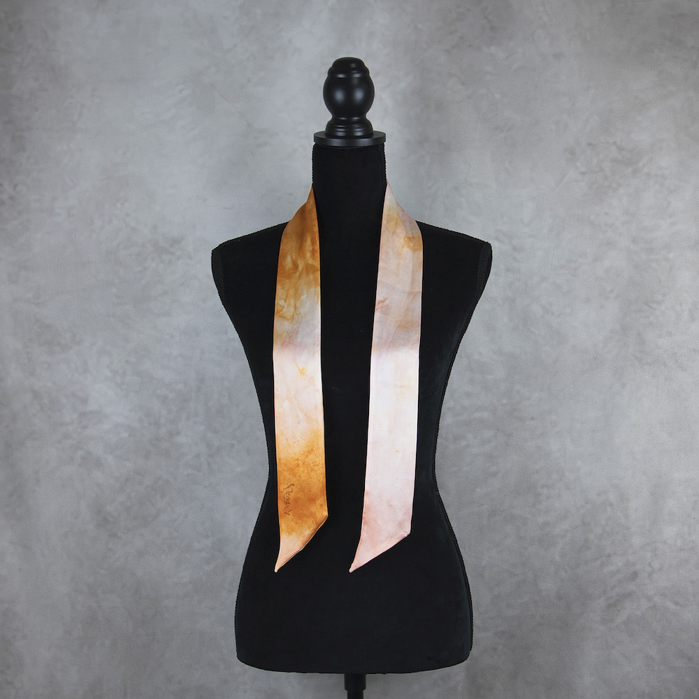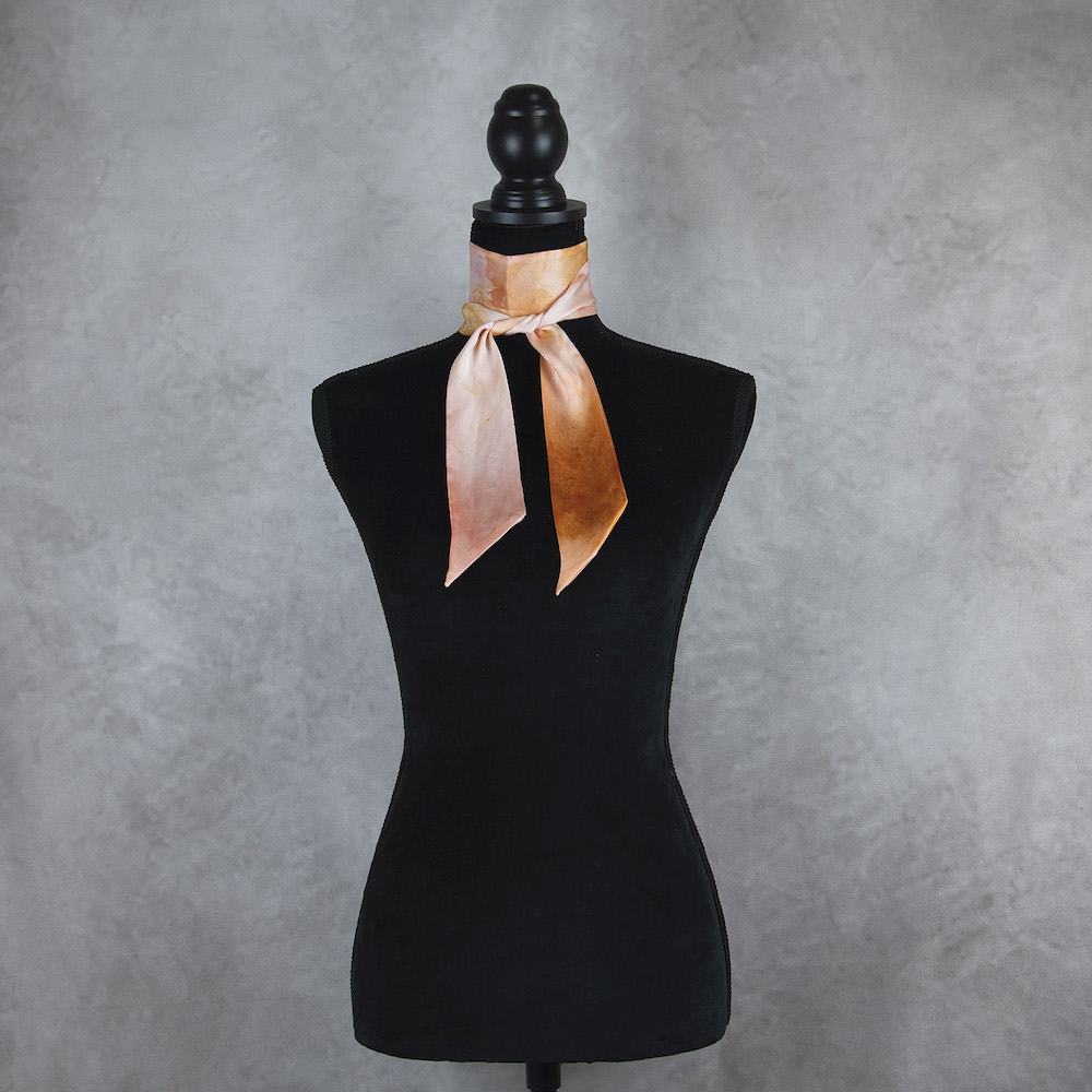 Postup tvorby: Šatka je farbená špeciálnym spôsobom, 100% prírodným pigmentom určeným priamo na farbenie hodvábu. Farba je zafixovaná, šatka vypratá a ošetrená fixátorom farieb. Okraje sú ručne prešité a následne je celá šatka vyžehlená.