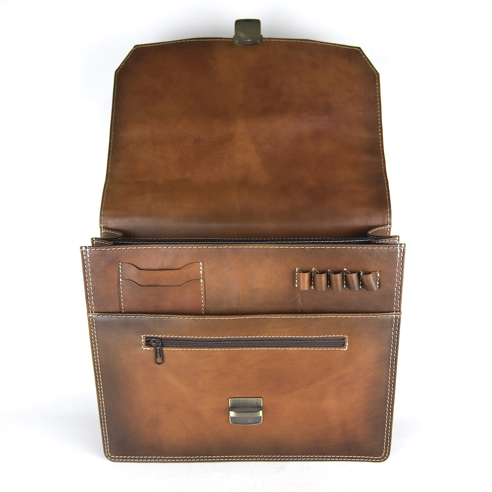 Používame len pravú hovädziu kožu z overených zdrojov. Tá sa postupne prispôsobuje svojmu majiteľovi, získava prirodzenú patinu a s časom sa stáva ešte krajšou. Každý detail – od šitia, cez zapínanie, až po vnútorné priečinky – je navrhnutý tak, aby spĺňal potreby moderného profesionála, ktorý si potrpí na kvalitu a spoľahlivosť.