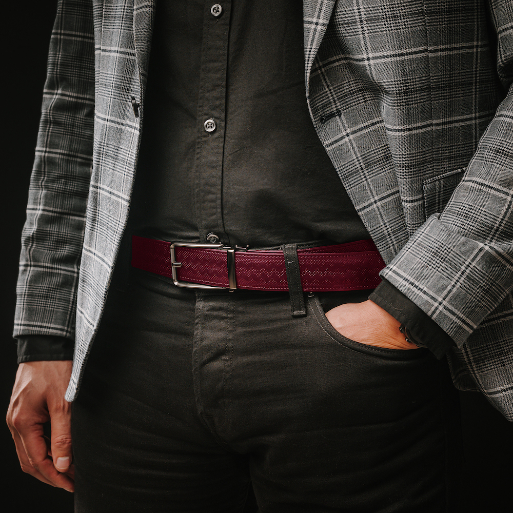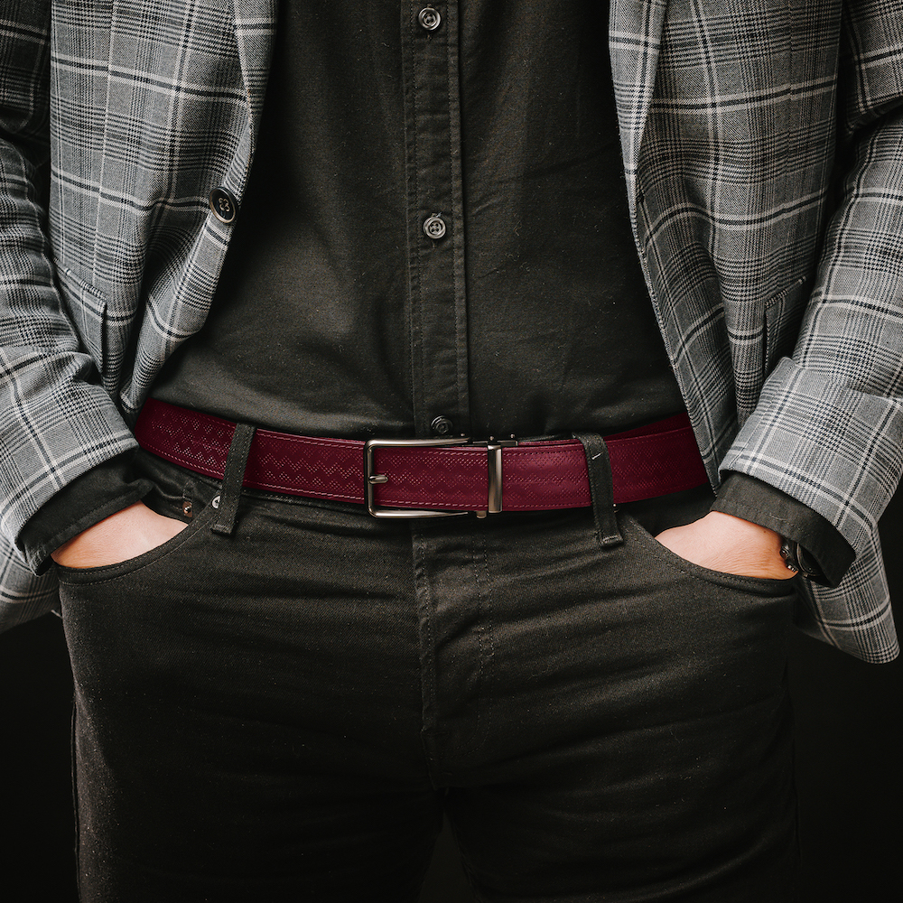 Kožený opasok s dekorom a automatickou prackou – BLACK CLOSE, limitovaná edícia, bordový