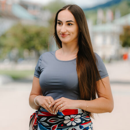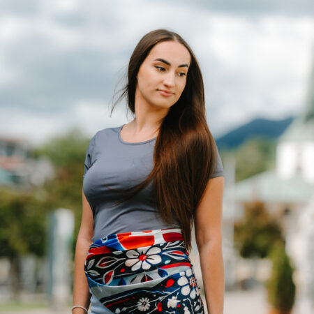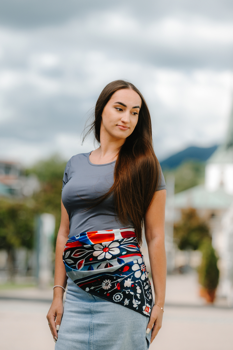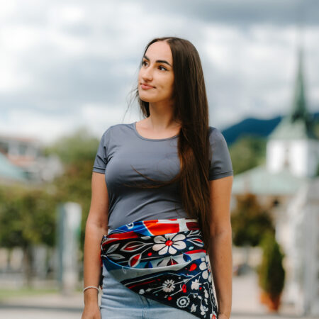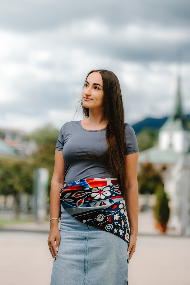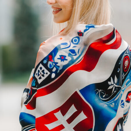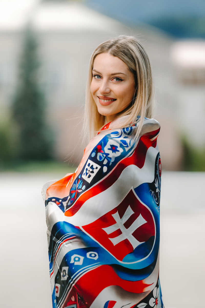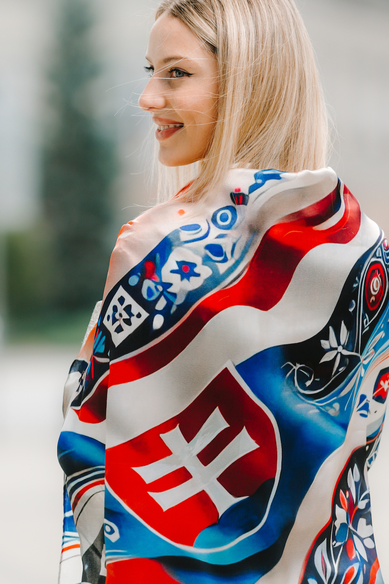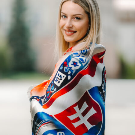 Slovenská vlajka je trikolóra zložená z troch vodorovných pruhov: bieleho, modrého a červeného. Na prednej polovici vlajky je umiestnený slovenský štátny znak. My sme ju dotvorili do kreatívnej podoby na hodvábnu šatku.