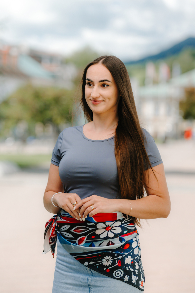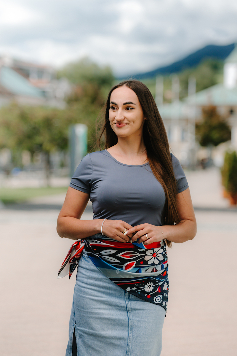-klasická šatka okolo krku – vďaka vlastnostiam hodvábu je vhodné nosenie celoročne